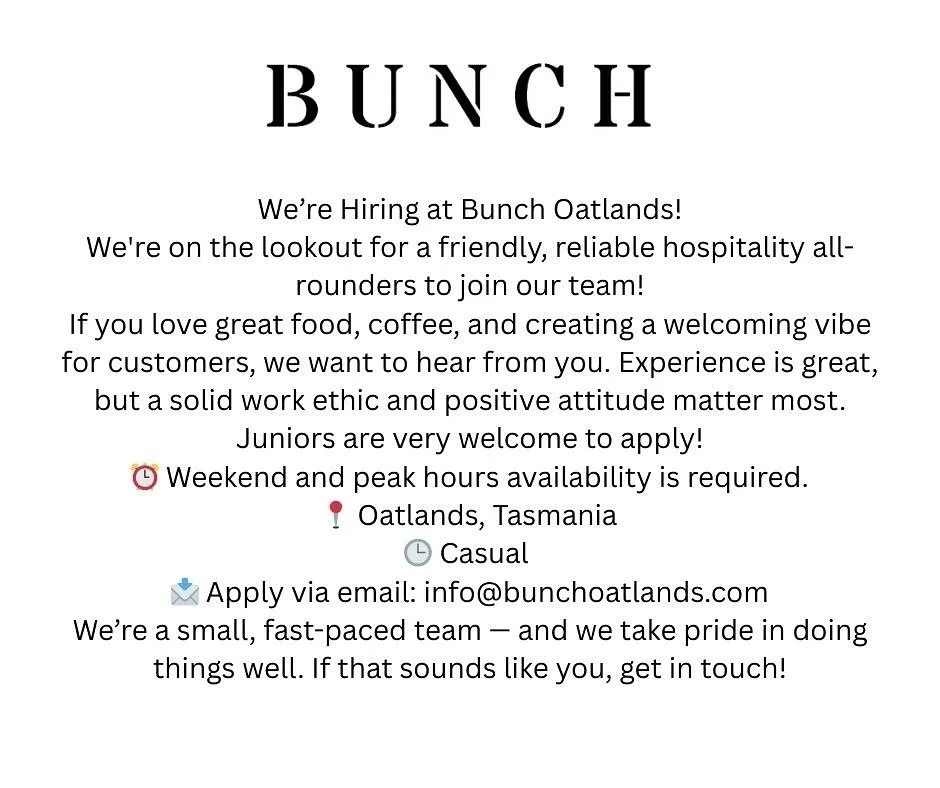 Bunch Oatlands has an ever evolving supply of seasonal produce sourced across Tasmania and we utilise these items in all of our meals - we like simple, but boy oh boy does the flavour pack a punch. If you like it, grab it off the shelf and take it home with you! Some staple items we have in store are Jean Pascal pastries & quiches, Tasmanian Juice Press + so much more!